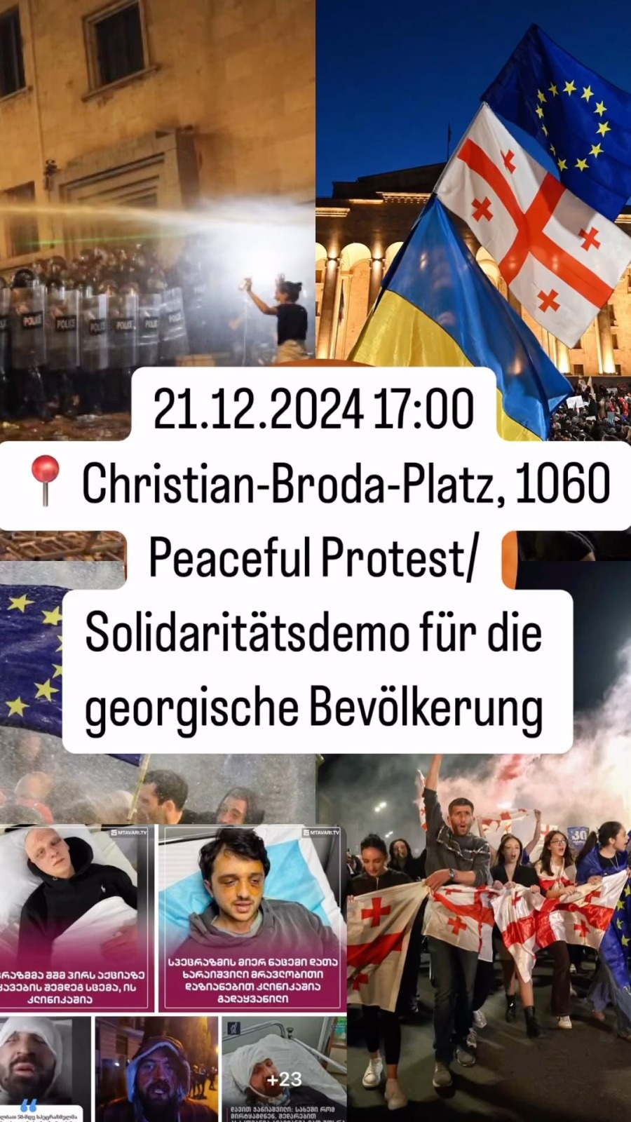 Am Samstag, 21. Dezember 2024, findet um 17 Uhr am Christian-Broda-Platz die Solidaritätsdemonstration für Georgien statt. Georgien ist und möchte Teil Europas sein und wehrt sich mit seiner Präsidentin Salome Surabischvili gegen die Zerstörung der georgischen Demokratie und seiner Integration in die EU durch die Handlanger des Kreml. Dieser setzte während der Wahlen alle schon aus den Zeiten des KGB bekannten Werkzeuge gegen Georgien ein PLUS die in unserer Zeit hinzugekommen sozialen Medien, das Werkzeug des “digitalen Krieges”. In Georgien spricht man von Russlands “Wahlkrieg” gegen Moldawien, Georgien, Rumänien. Die georgische Präsidentin hielt am 18. Dezember 2024 eine bewegende Rede im Europäischen Parlament: https://multimedia.europarl.europa.eu/de/video/formal-sitting-with-salome-zourabichvili-president-of-georgia-address-by-salome-zourabichvili-president-of-georgia_I265586